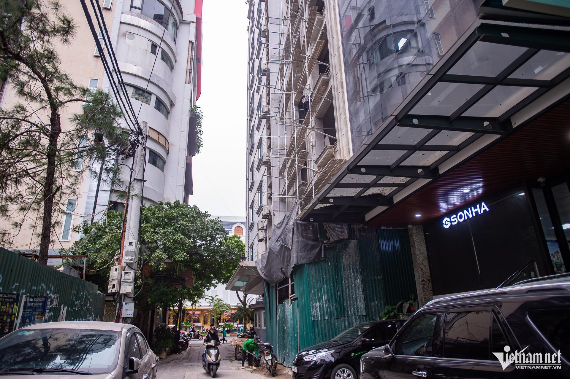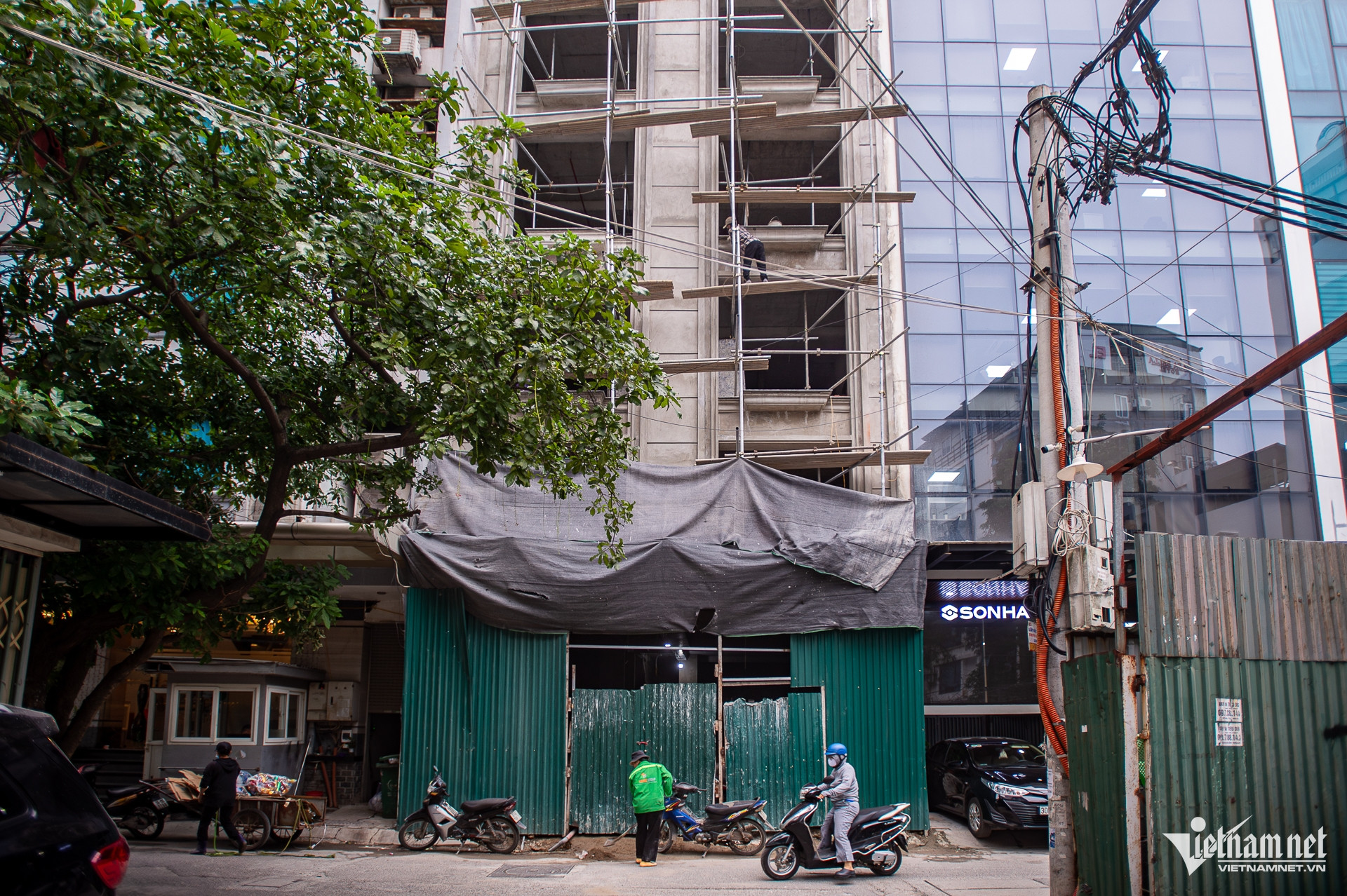 Thậm chí, tại một công trình trong ngõ 76 Trần Thái Tông, không hề có lưới chắn bụi, giàn giáo được dựng sát mép đường, trong khi phía trên, công nhân vẫn đang thi công.