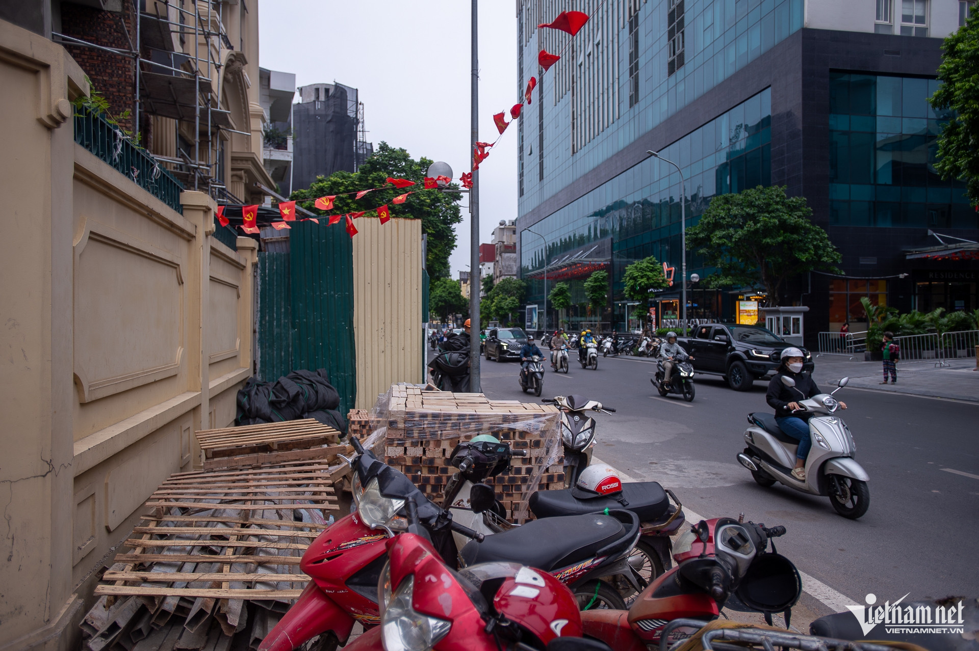 Tại một công trình đang thi công trên đường Nguyễn Khánh Toàn, vật liệu xây dựng được tập kết ngay trên vỉa hè. Những khối vật liệu nặng hàng chục cân được tời kéo bằng máy móc thô sơ, trong khi xung quanh vẫn có nhiều người qua lại.