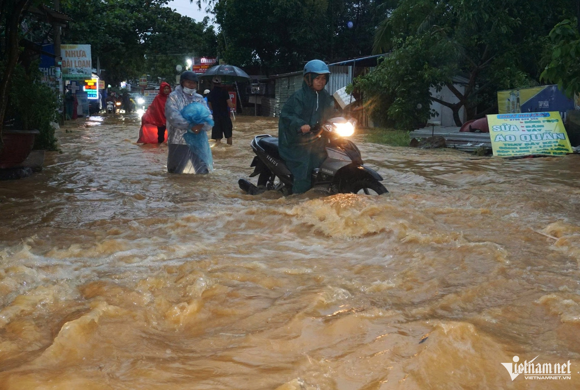 Ghi nhận của PV, nhiều tuyến đường khu vực Khu công nghiệp Hòa Khánh và phường Liên Chiểu bị ngập nặng, nước từ khu vực núi đổ xuống cuồn cuộn, tạo thành dòng chảy xiết tràn qua khu dân cư.