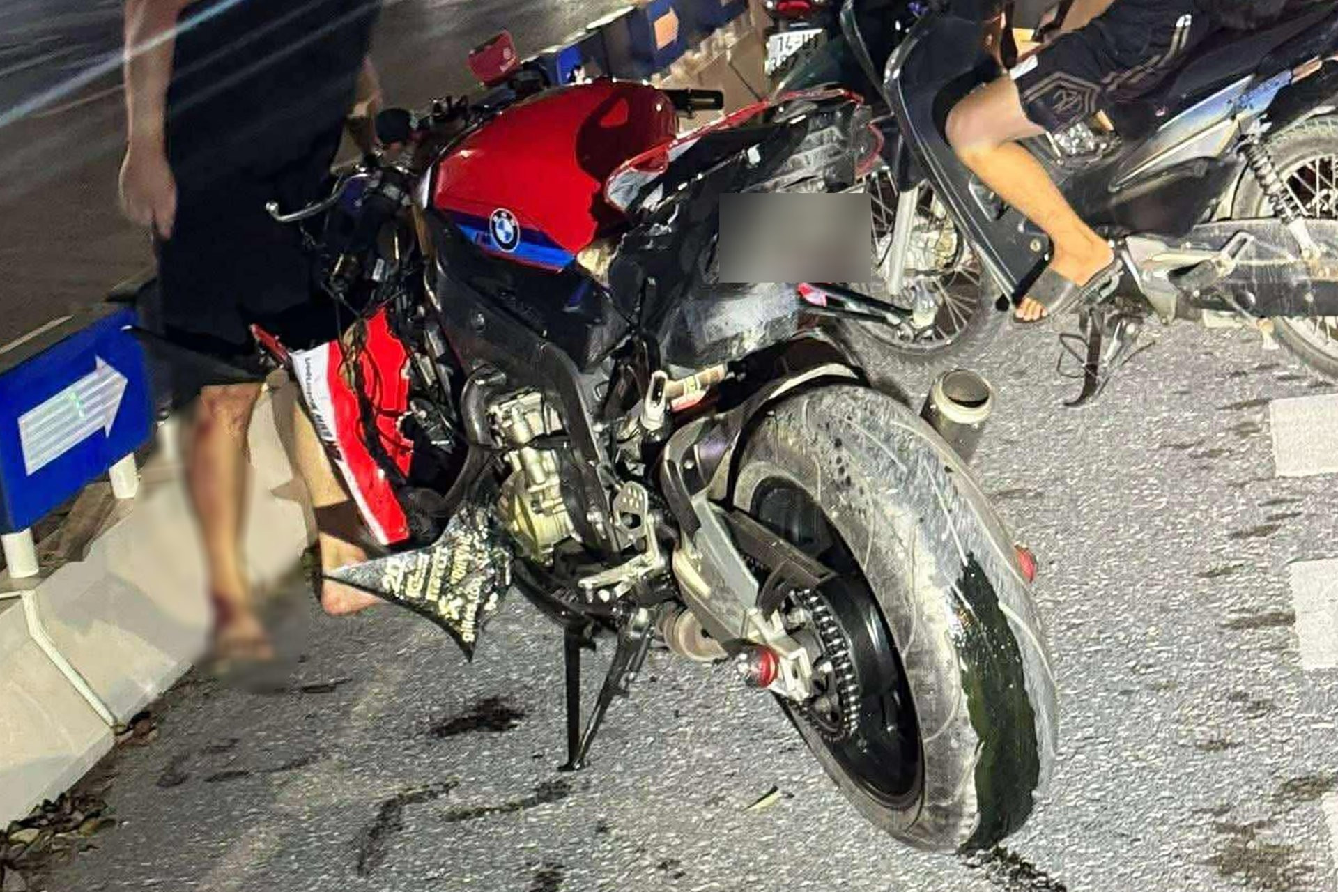 Tại hiện trường, xe máy bị hư hỏng nặng, văng lên sạp trái cây; ô tô bung túi khí, vỡ két nước và kính trước. Trụ điện và biển báo giao thông bị gãy.